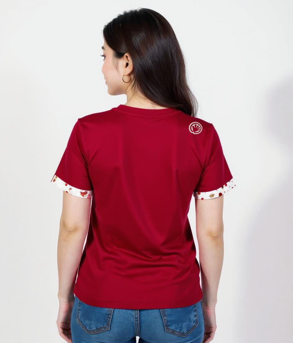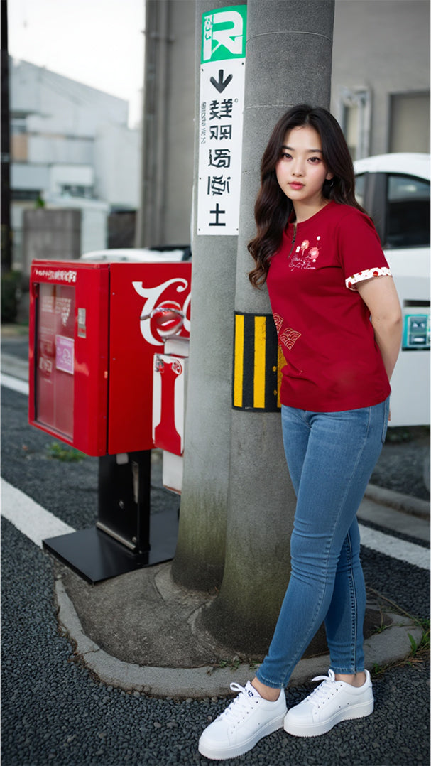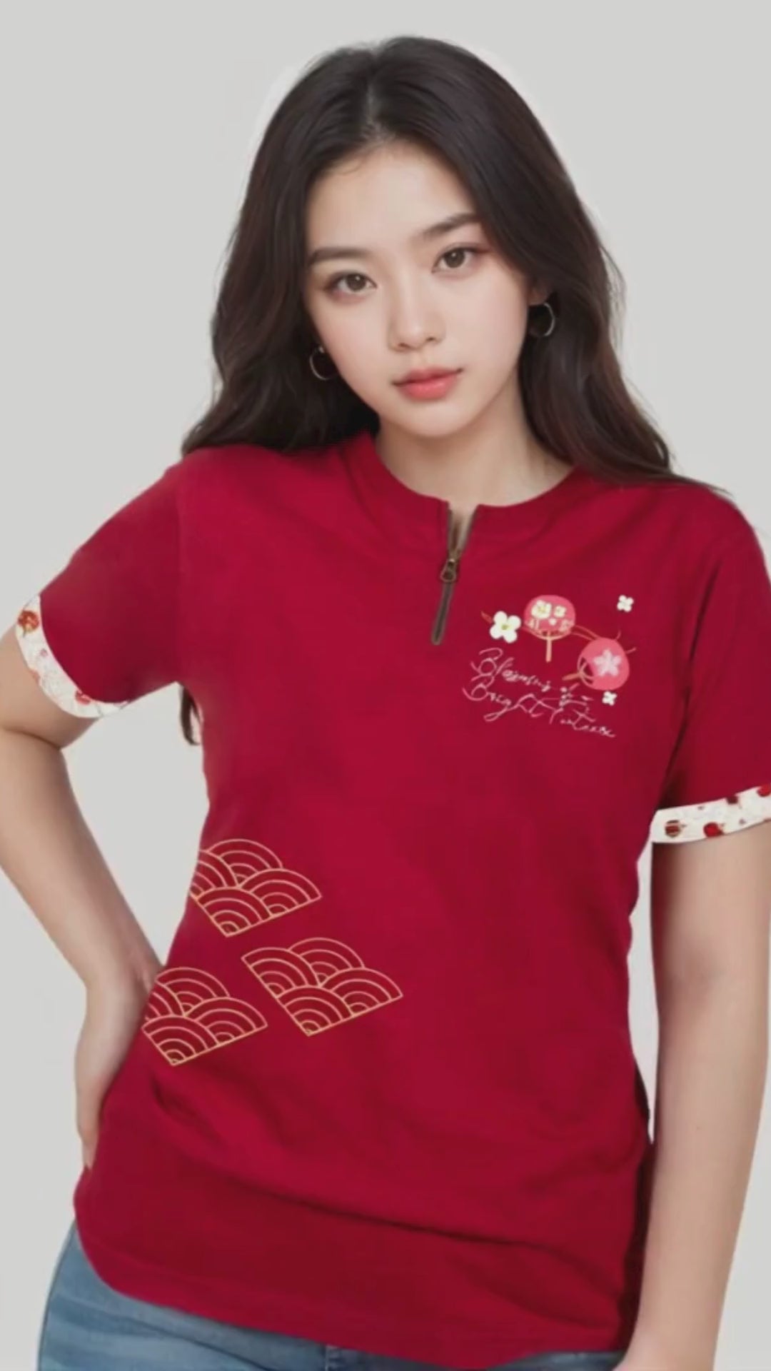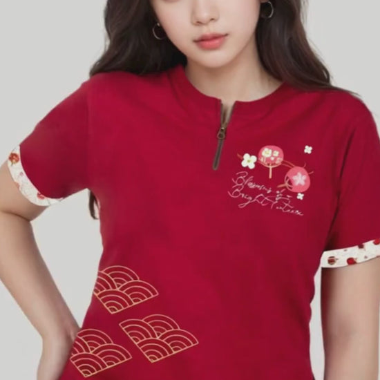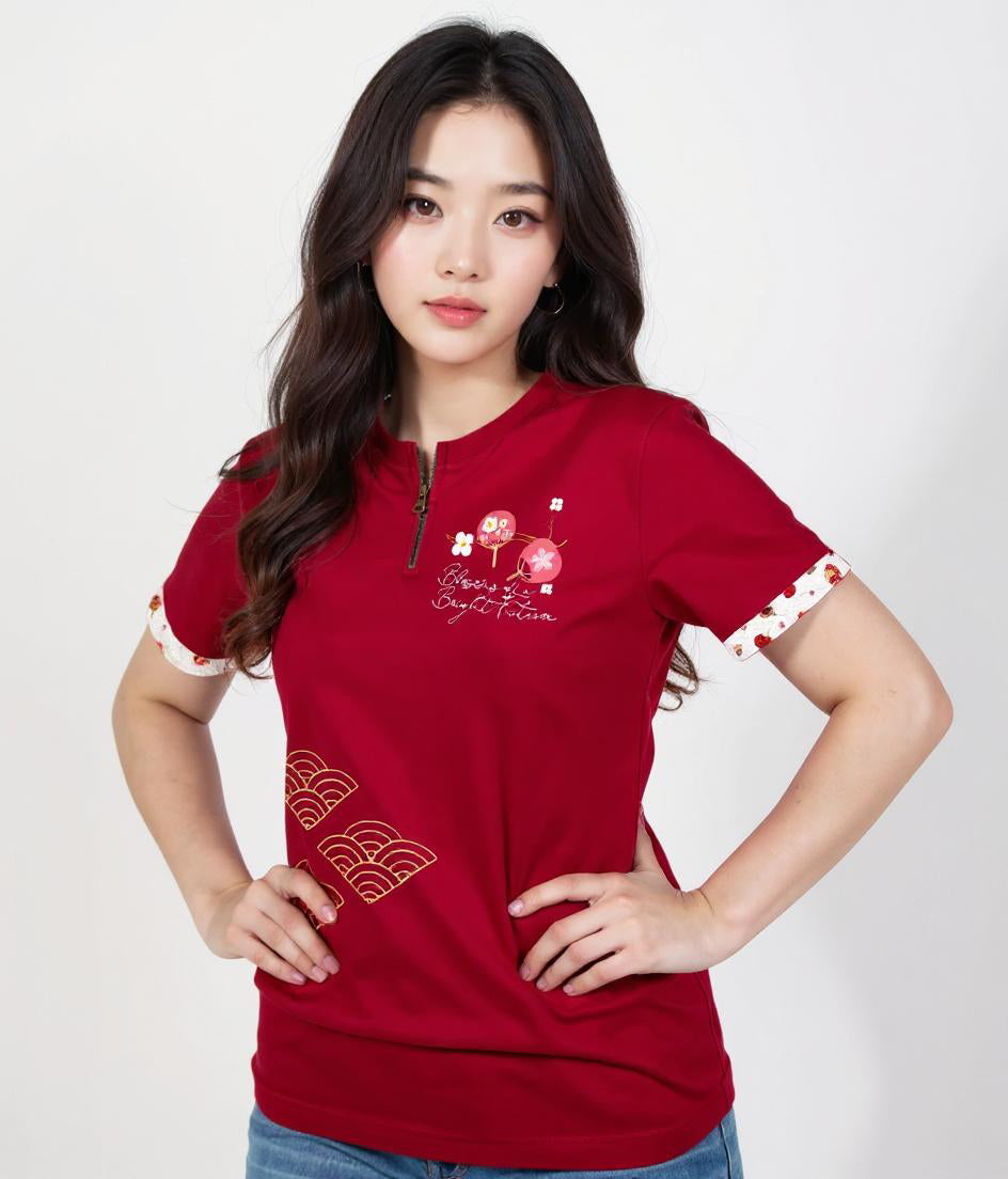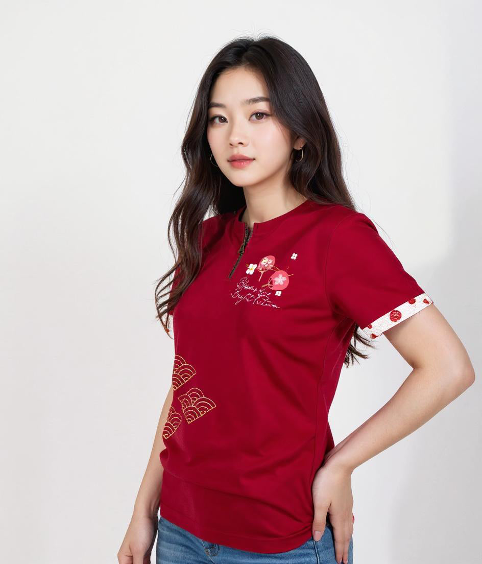 "The Lunar New Year edition t-shirt features a beautifully crafted design centered on a traditional Chinese fan adorned with intricate patterns, symbolizing elegance and cultural heritage. The fan is complemented by luxurious gold printing, adding a touch of opulence and festivity. At the heart of the design, the phrase 'Blossoms of a Bright Future' is gracefully displayed, reflecting hope, prosperity, and renewal for the coming year. This t-shirt perfectly blends tradition and modernity, making it a meaningful addition to the Lunar New Year celebrations."
