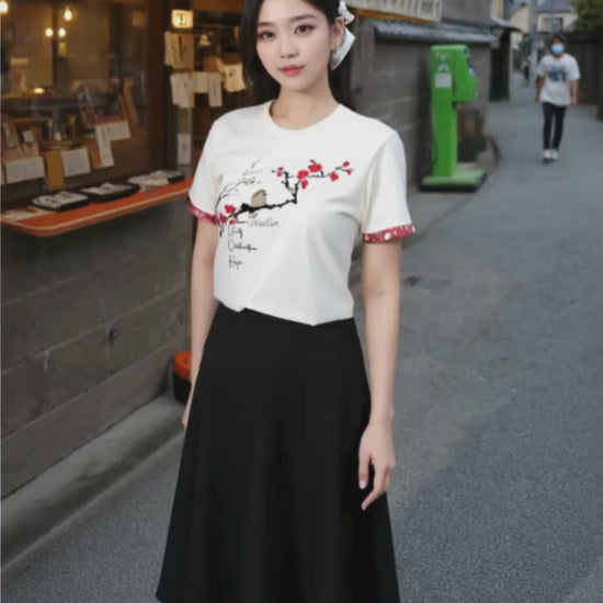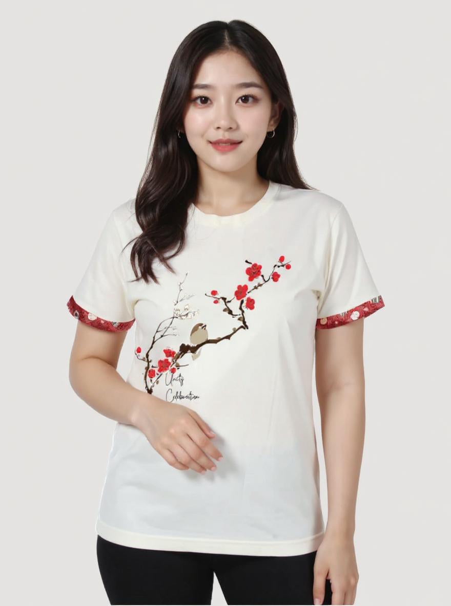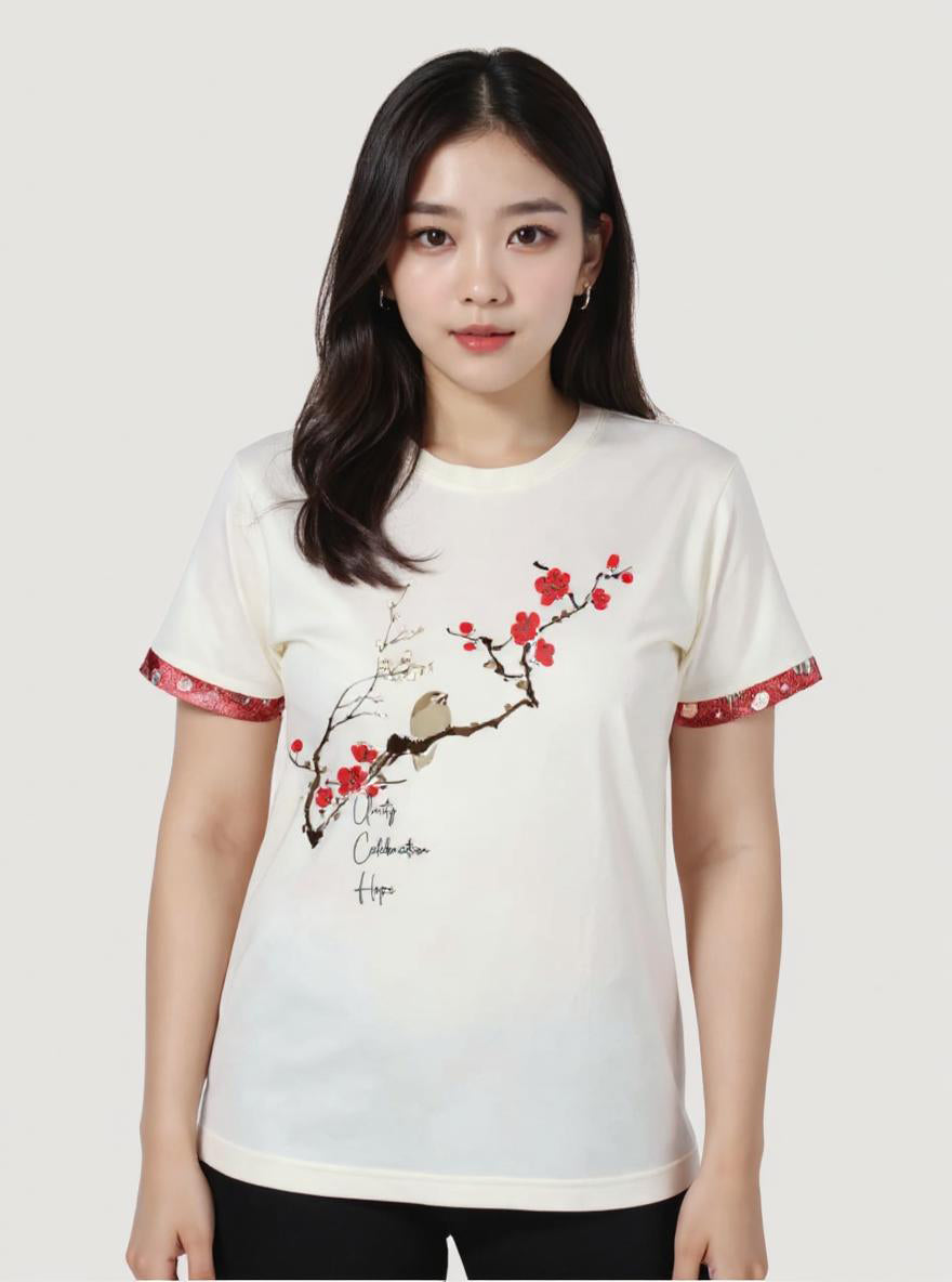 "The Lunar New Year edition t-shirt features a stunning Chinese painting-inspired design, showcasing a delicate bird perched gracefully on a blossoming branch, symbolizing harmony with nature. The intricate brushwork captures the elegance and cultural richness of traditional Chinese art. Beneath the artwork, the words 'Unity, Celebration, Hope' are beautifully inscribed in an elegant typeface, embodying the spirit of togetherness and optimism for the year ahead. Perfect for marking the festive season with style and meaning."