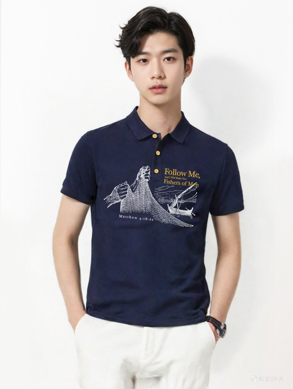 The t-shirt design portrays a fisherman's hand clutching a fish net, alongside a poignant typo that reads: "Follow Me and I will make you a fisher of men," accompanied by the inspiring Bible verse Matthew 4:16, capturing the essence of discipleship and divine calling.