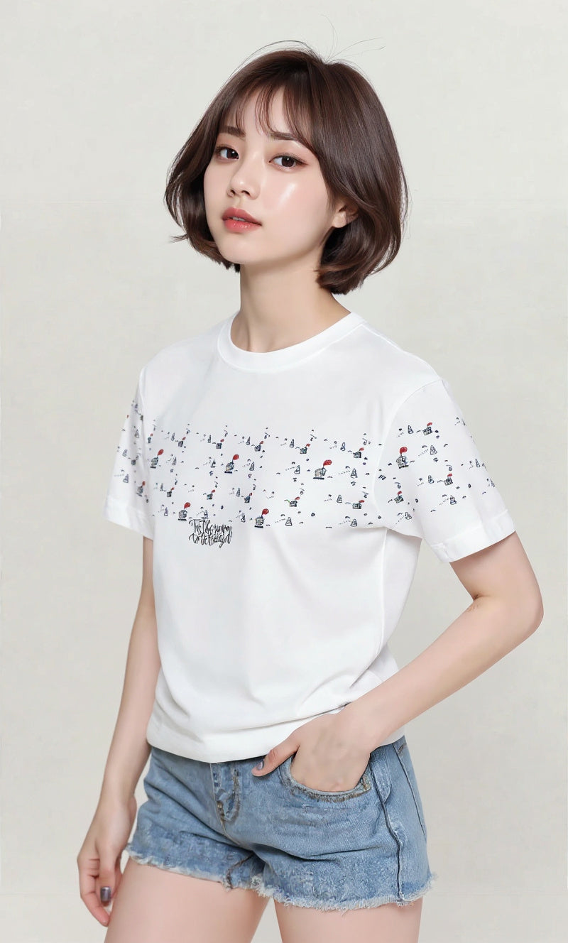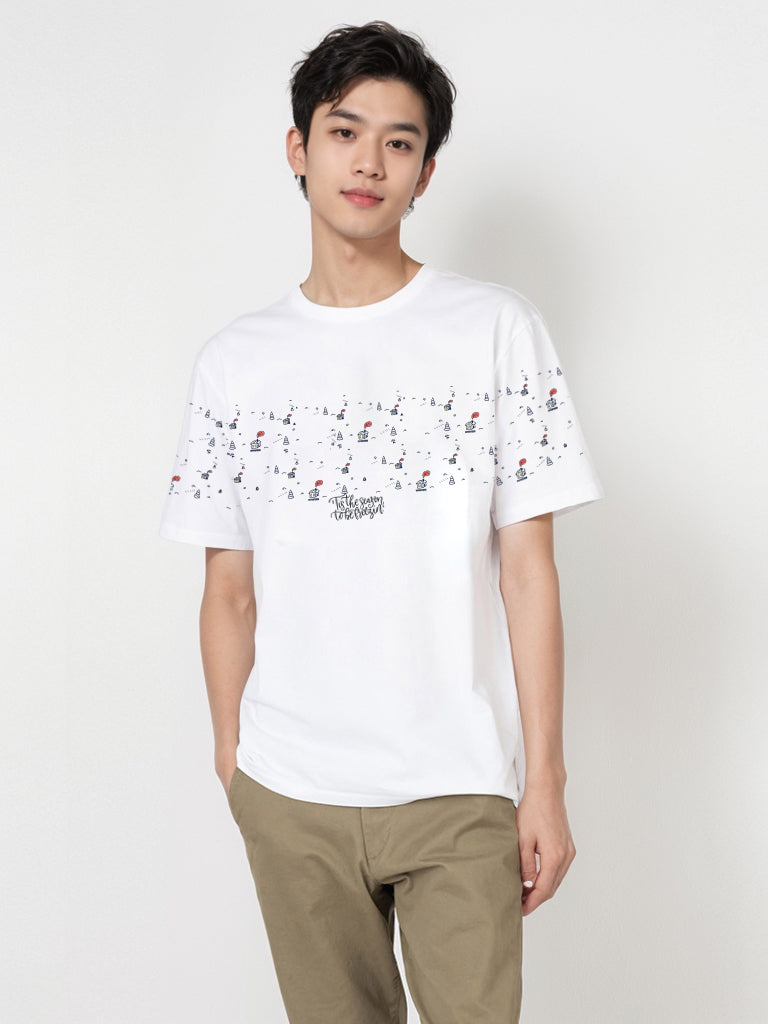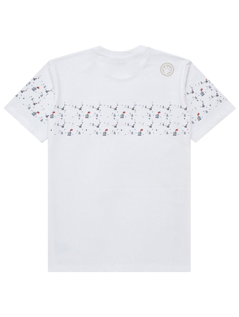 The T-shirt design features a clean and minimalist aesthetic on a crisp white base. Across the chest and extending to the sleeves, a horizontal band is decorated with a repeating pattern of small, whimsical illustrations. These motifs include playful, doodle-like characters and simple objects, giving the shirt a lively yet subtle charm. At the center of the chest, within the patterned band, a hand-drawn styled text reads “Let the snow take us away”, blending naturally with the surrounding artwork. The color palette is primarily monochrome with delicate accents of red and blue, creating a balanced contrast that keeps the design light and cheerful. This T-shirt captures a casual, youthful vibe while maintaining a modern and versatile look.
