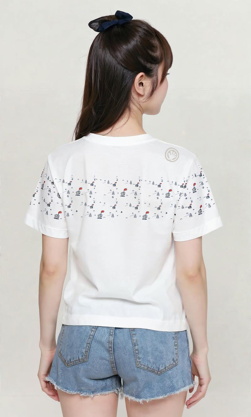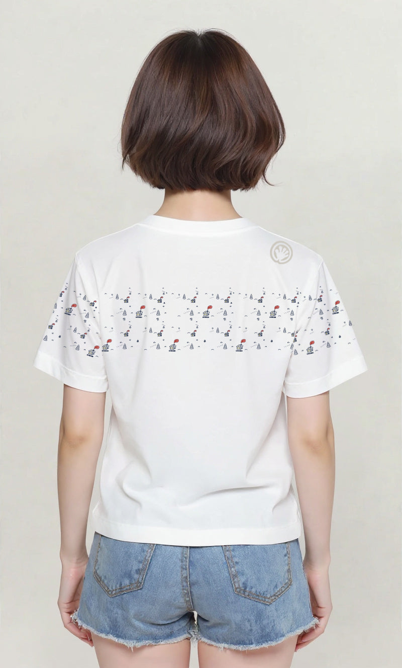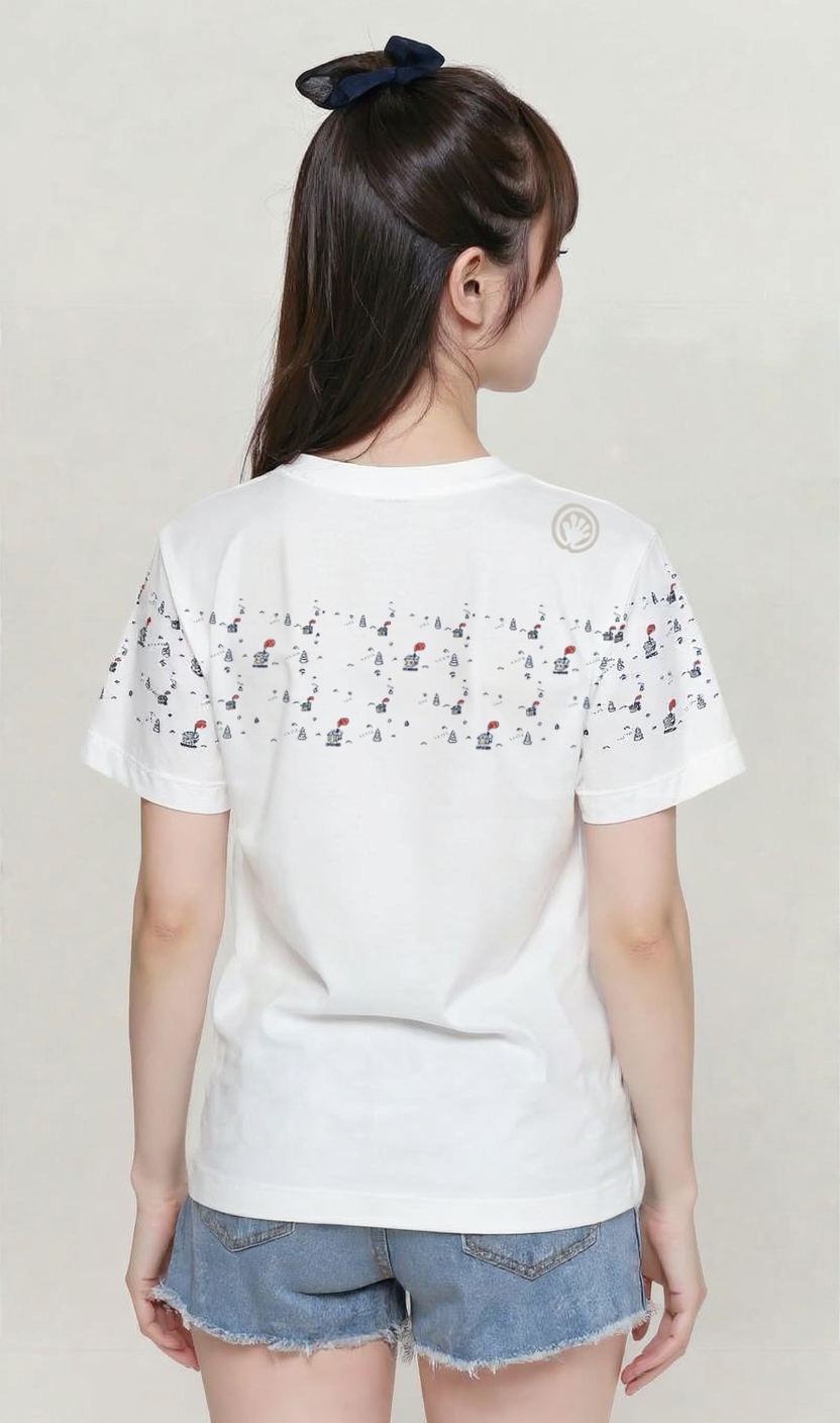 The T-shirt design features a clean and minimalist aesthetic on a crisp white base. Across the chest and extending to the sleeves, a horizontal band is decorated with a repeating pattern of small, whimsical illustrations. These motifs include playful, doodle-like characters and simple objects, giving the shirt a lively yet subtle charm. At the center of the chest, within the patterned band, a hand-drawn styled text reads “Let the snow take us away”, blending naturally with the surrounding artwork. The color palette is primarily monochrome with delicate accents of red and blue, creating a balanced contrast that keeps the design light and cheerful. This T-shirt captures a casual, youthful vibe while maintaining a modern and versatile look.