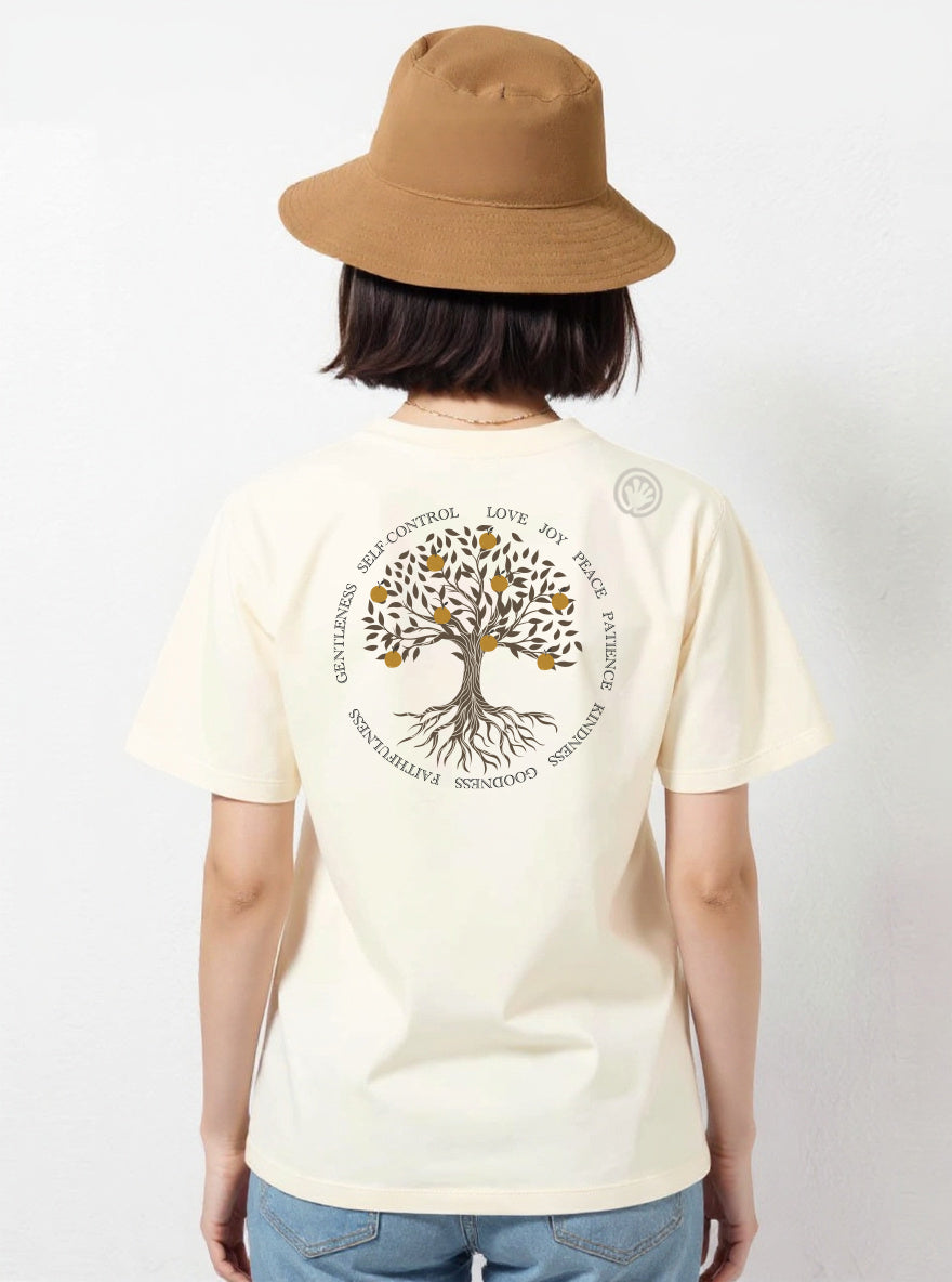 The t-shirt design beautifully illustrates the fruits of the spirit, radiating love, joy, peace, patience, kindness, goodness, faithfulness, gentleness, and self-control, inspiring a life filled with spiritual abundance.