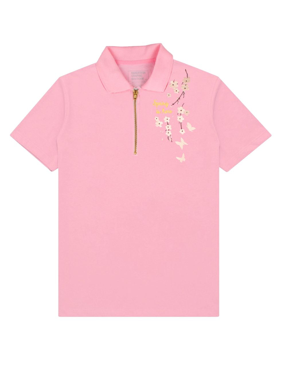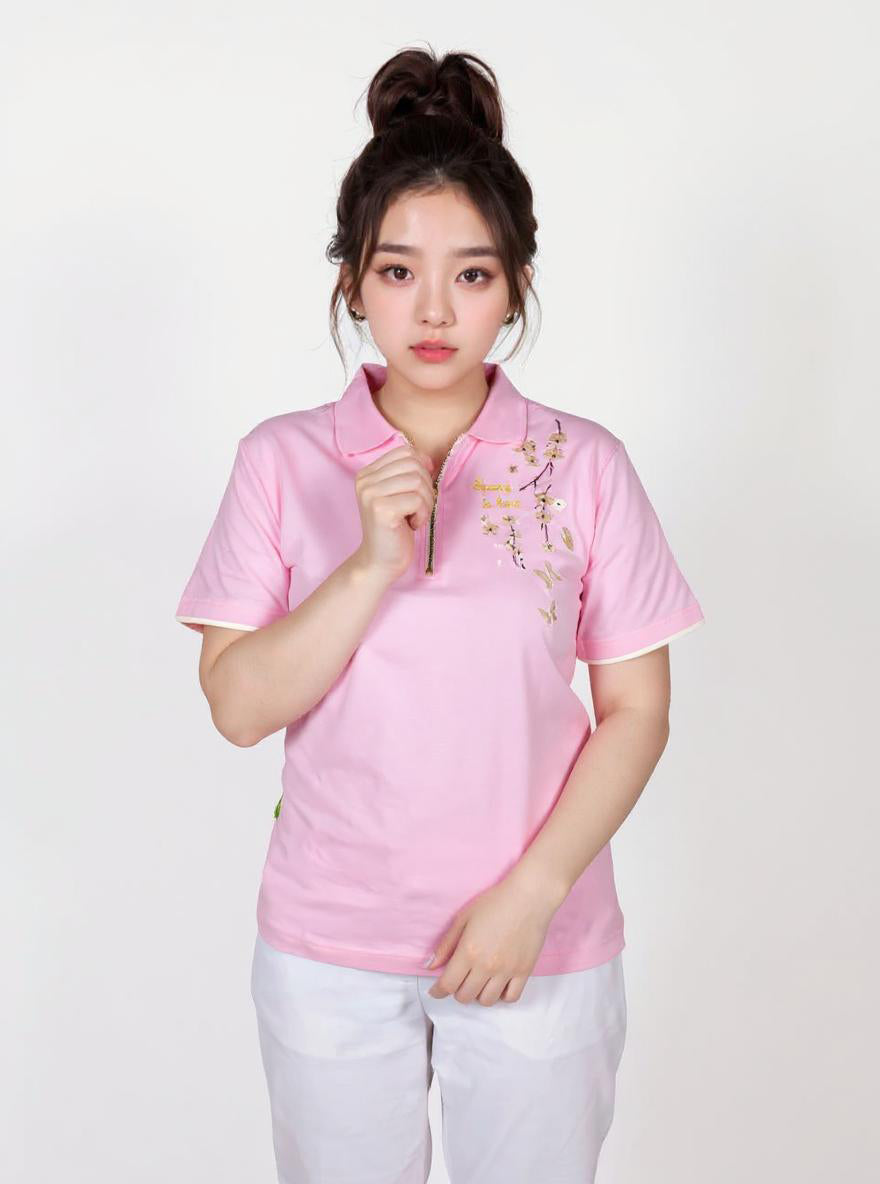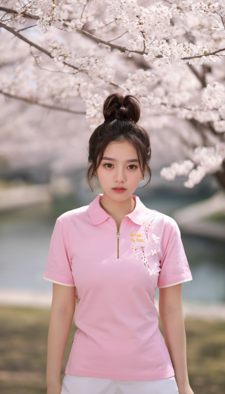 The collar shirt features a soft pink base, symbolizing warmth, renewal, and the beauty of spring. Delicately embroidered on the upper left are elegant cherry blossom flowers, their petals gracefully scattered to create a natural and serene aesthetic. Alongside the floral embroidery, the phrase **"Spring is Here"** is finely stitched in an elegant cursive script, enhancing the shirt’s seasonal charm. The combination of soft pink fabric, intricate cherry blossom details, and thoughtful embroidery makes this shirt a perfect blend of sophistication and seasonal celebration, ideal for both casual and semi-formal occasions.