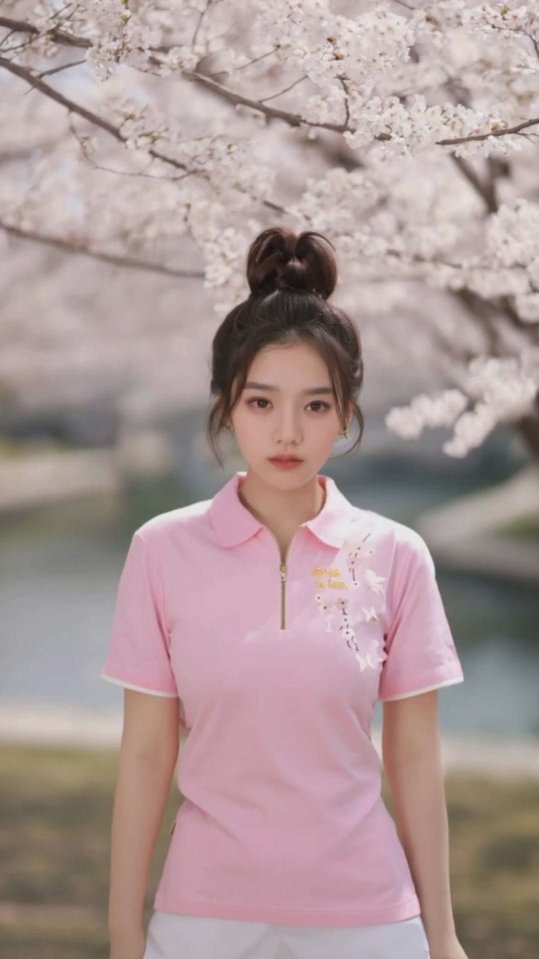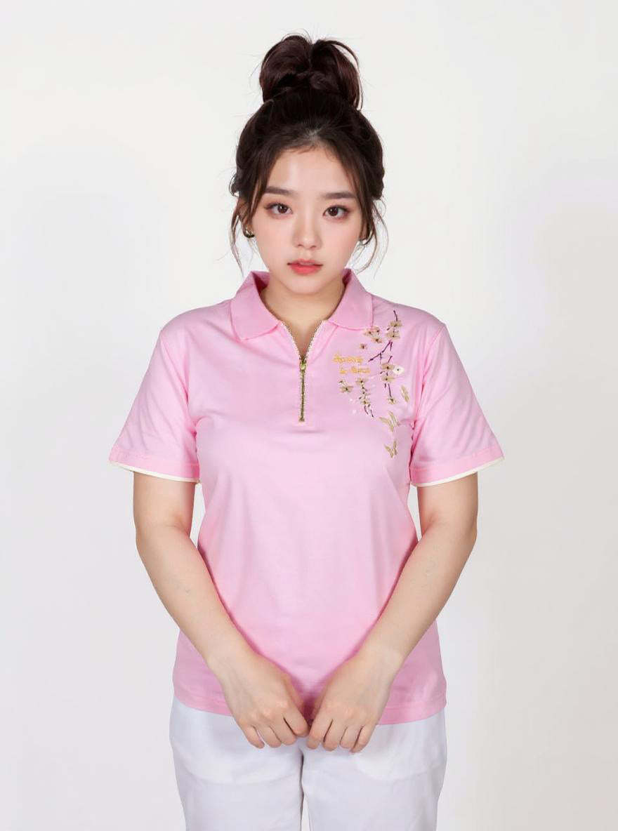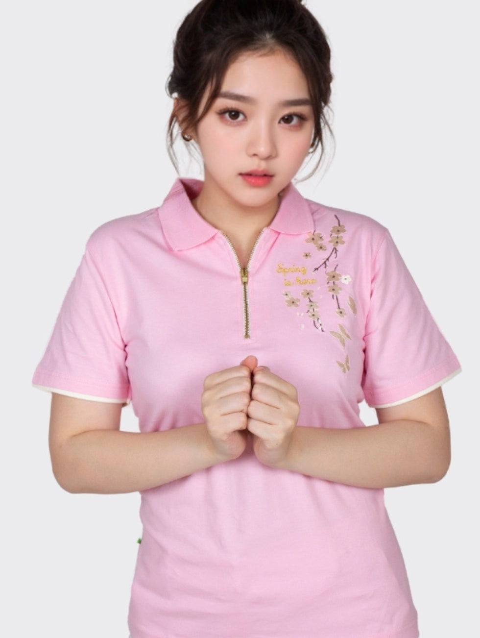 The collar shirt features a soft pink base, symbolizing warmth, renewal, and the beauty of spring. Delicately embroidered on the upper left are elegant cherry blossom flowers, their petals gracefully scattered to create a natural and serene aesthetic. Alongside the floral embroidery, the phrase **"Spring is Here"** is finely stitched in an elegant cursive script, enhancing the shirt’s seasonal charm. The combination of soft pink fabric, intricate cherry blossom details, and thoughtful embroidery makes this shirt a perfect blend of sophistication and seasonal celebration, ideal for both casual and semi-formal occasions.