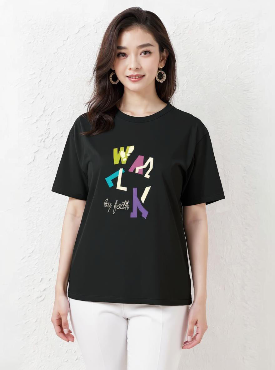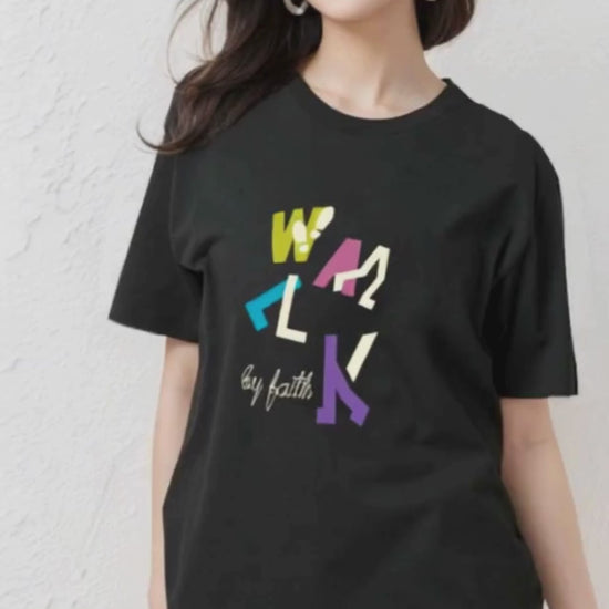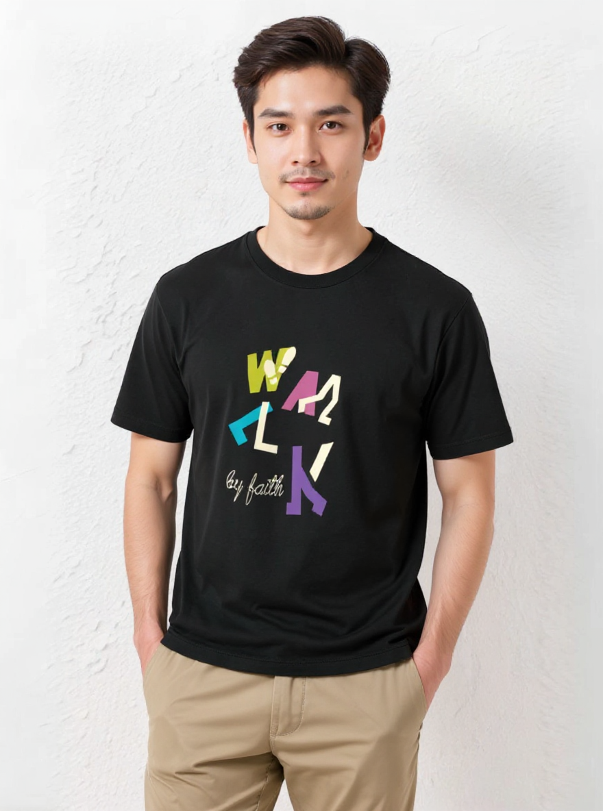 I walk by faith, not by sight, trusting in the Lord's guidance every step of the way. The t-shirt design features the word "walk" creatively crafted with each letter resembling a foot in motion, adding a unique and lively touch to the design.